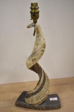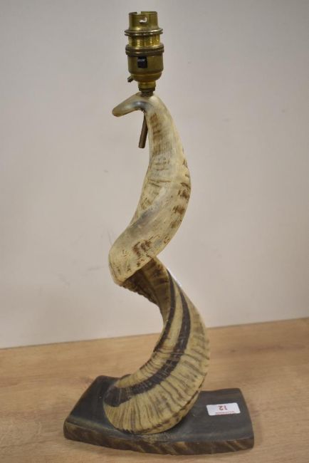 A 20th-century Folk Art animal-horn lamp, mounted on a wooden base, the horn itself is lightly coloured, with a textured natural finish and a curving shape, an electrical lamp fitting has been added, but the wire has since been cut, 44cm.