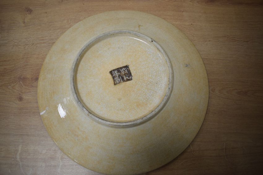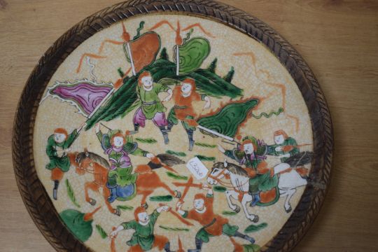 A selection of 19th to 20th-century Chinese porcelain plates, to include a mid-century example decorated with peony-style flowers and dragonfly-like creatures, marked to the reverse “Qianlong Nian Zhi”; a famille rose Mun Shou example, featuring yellow floral patterns and four medallions of Chinese characters; and a larger 19th-century Samurai warrior charger with crackle glazing, depicting a figural scene of warriors, sealed to the reverse, (3).