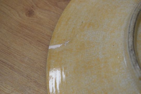 Condition Report: a few small chips to rim of larger charger and crack to the back consistent with age and use, slight areas of surface wear to all plates.