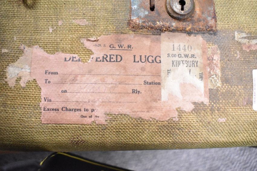 An early 20th century wood-framed suitcase, exterior lining in green canvas, measures 27 x 10 x 18 inches.