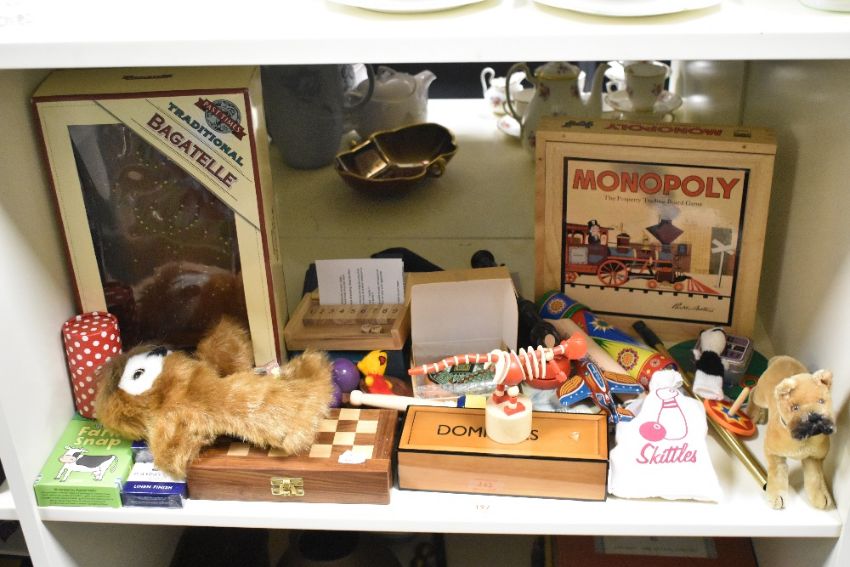 A selection of 20th-century games, toys, and books, to include a 2003 Parker Brothers edition wooden Monopoly game board, styled after the 1930s and emulating one of the earliest Monopoly boards and gameplay; a Past Times traditional Bagatelle board; a vintage Steiff mohair Boxer dog; a small wooden chess board, with pieces, and an interior backgammon board; Past Times wooden dominoes; a travel-sized Scrabble; an F. Warne & Company Limited edition of The Tale of Ginger and Pickles by Beatrix Potter; a small set of wooden skittles; and more. Most items are in unused or very good used condition.