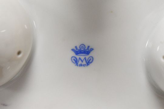 Two late 19th to early 20th-century German Rococo-style porcelain centrepieces, to include a Von Schierholz example, featuring a pierced basket-like dish lavishly adorned with handcrafted and hand-painted flowers in vibrant colours, gilded decoration, two prominent cherubs—one reading, the other playing a lute—and four intricately scrolled feet, marked to base, 33cm; and a Sitzendorf-style example, featuring a pierced oval lattice basket top encrusted with hand-painted flowers and gilded accents, set upon a conforming column and base with a seated cherub, marked to base, (2), significant repaired damage to the basket where it joins the column of the Sitzendorf-style example.