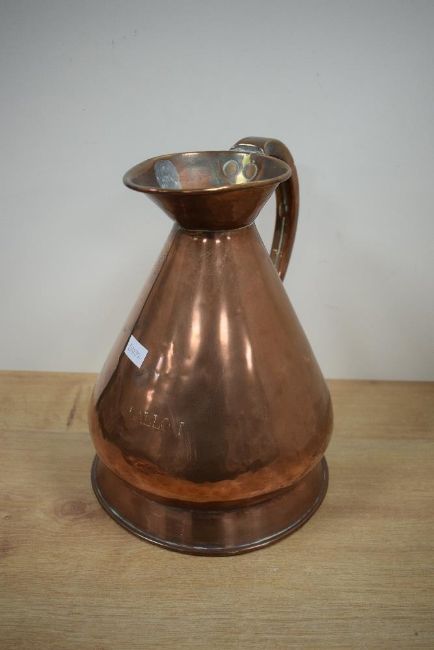 A 19th-century English copper haystack 1-gallon measuring jug, characterised by a narrow top, broad base, large spout, and curved handle; sold with a 20th-century Moroccan-style polished copper circular tray, featuring an etched central design of an eight-pointed star motif surrounded by geometric patterns and interlacing lines, modified with a hanging loop to the back, (2).