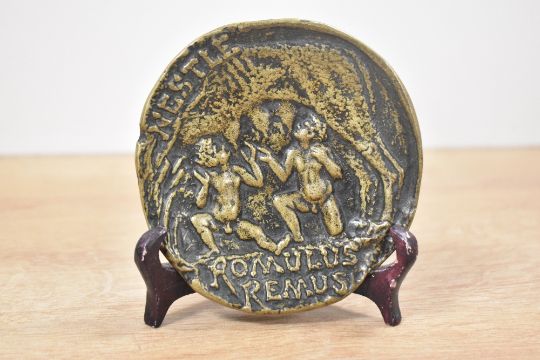 A mid 20th-century Max Le Verrier bronze pocket ashtray produced for Nestle, depicting the famous Roman myth of Romulus and Remus, marked to base, 10cm.