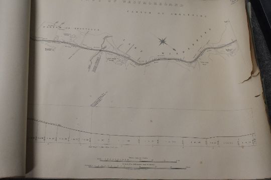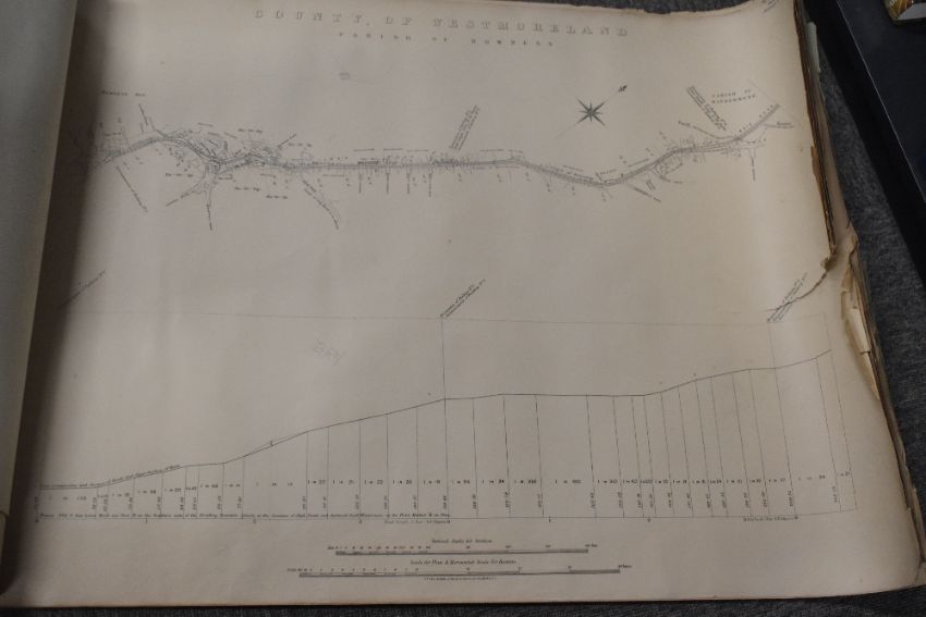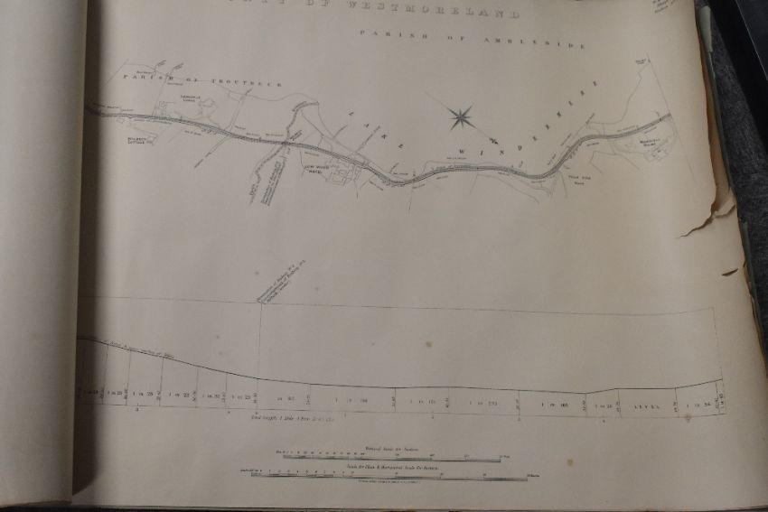 Railways. Lake District. The Light Railway Commissioners. Windermere and District Light Railways. Plans and Sections. November, 1899. Stephen Sellon, Engineer. London: C. F. Kell & Son. 1899. Original paper wrapps. Bound at the front are two ordnance survey sheets with the proposed Bowness to Ambleside line highlighted. Followed by six number sheets detailing the proposed line/route. There is a 4-5' tear to the fore-edge of each sheet. The whole is curled at both edges from having been rolled previously. (1)