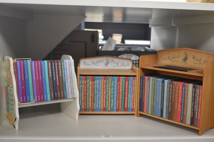 Beatrix Potter. Two vintage Peter Rabbit's Book Shelf units, each housing a modern set of the twenty-three picture books. With; a 1987 'my Peter rabbit Book Shelf' housing a miscellaneous selection of modern reprint story books.