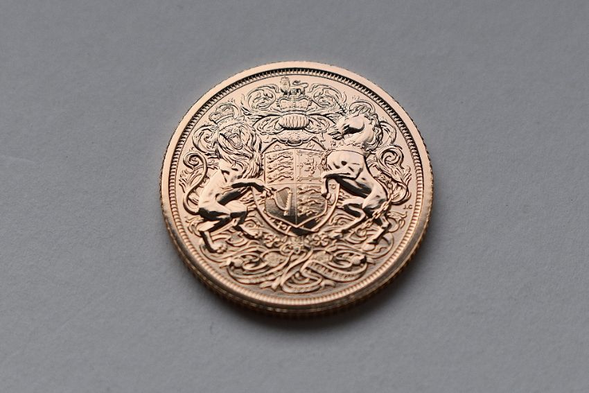 A Charles III 2022 Royal Mint BU Gold Sovereign, Memorial Issue, Rev Royal Coat Of Arms, 8.00 Grams, Encapsulated.