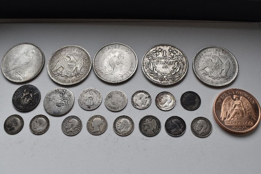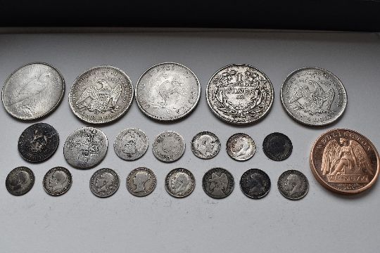 A Queen Anne Silver Shilling, A Queen Victoria 1845 Silver Threepence, Two Edward VII 1909 Silver Threepences, A George V 1916 Silver Shilling, A George V Sixpence, Seven George V Silver Threepences, 1916, 1917, 1918, 1919, A German Deutsches Reich Pfennig, A Chille Diez Centavos, Five USA Restrike Dollars (56)