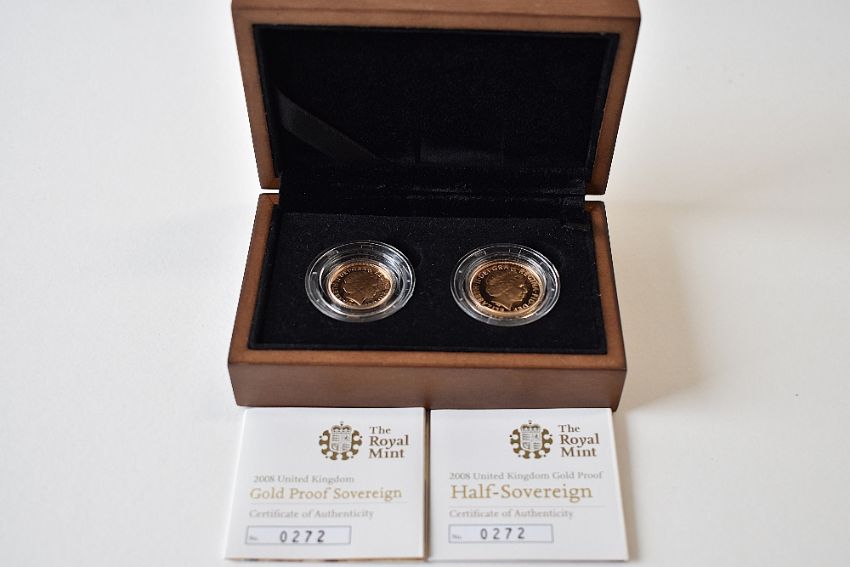 An Elizabeth II 2008 Royal Mint Proof Set Full Gold Sovereign, Rev George And Dragon 7.98 Grams And Half Sovereign, Rev George And Dragon, 3.99 Grams. Encapsulated In Presentation Box With Certificates 0272 And 0272.