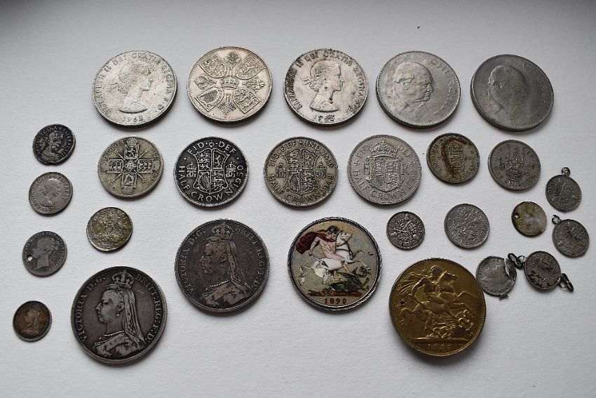 19th & 20th Century British Silver Coins Including Two Queen Victoria Crowns 1889 Jubilee Head, Rev George And Dragon, 1895 Old Head, Rev George And Dragon, Remnants Of Brooch Clasp, A Queen Victoria Silver Crown 1890 Jubilee Head, Rev Coloured Enamelled George And Dragon. An Elizabeth II 1953 Coronation Crown And 1965 Churchill Crowns x4, Three Halfcrowns 1948, 1950, 1962, A 1921 Florin, A Selection Of Shillings, Sixpences and Threepences Including A Queen Victoria 1887, An Australian 1928 Silver Sixpence, (27)Approx Silver Content 120 Grams.