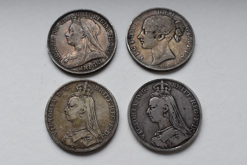 Four Queen Victoria Silver Crowns Comprising An 1845 Young Head, An 1890 And 1892 Jubilee Head, An 1893 Old Veiled Bust