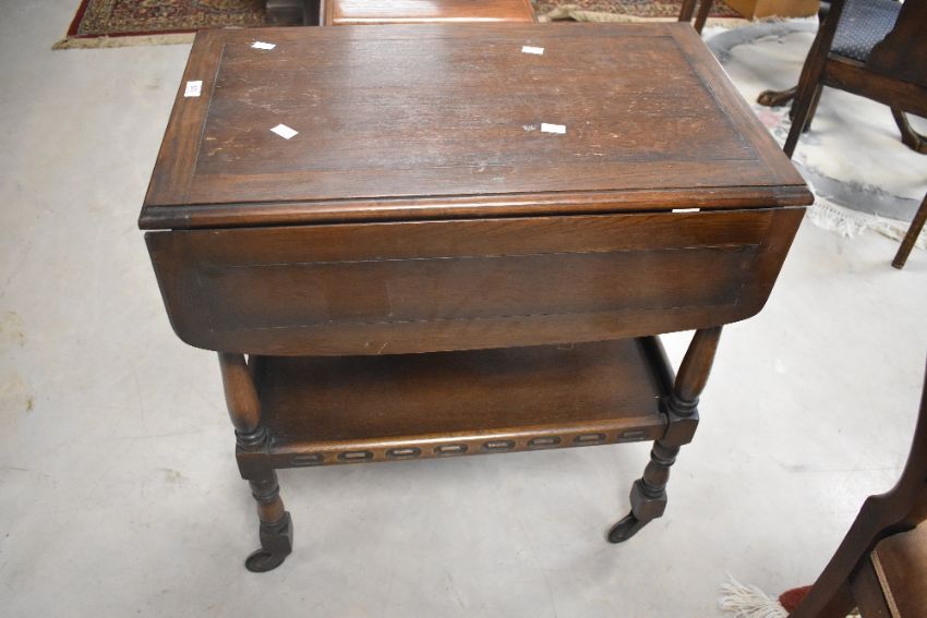 A vintage oak drop leaf teak trolley in the Priory style, approx. 68 x 42cm