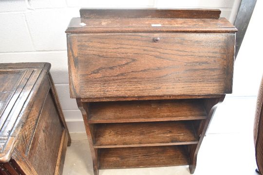 An early 20th Century oak bureau of slim form with open bookshelves , dimensions approx. H95 W67cm