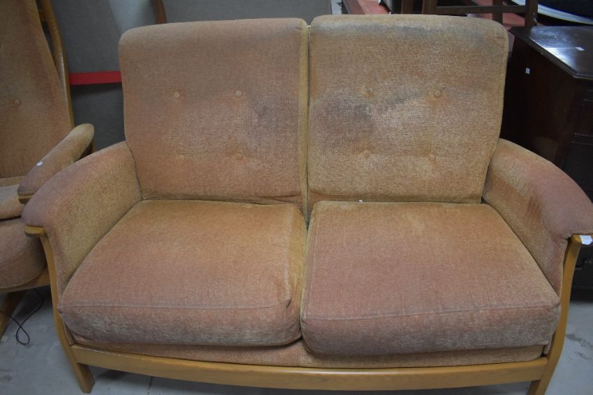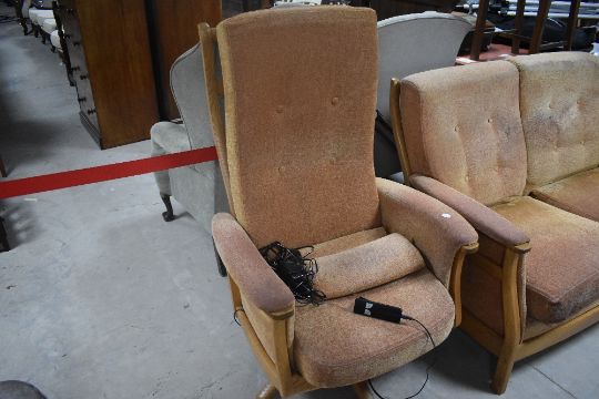 A modern Ercol three piece lounge suite comprising two settees and electric recliner chair, on stylised frames