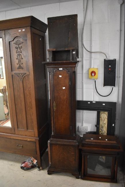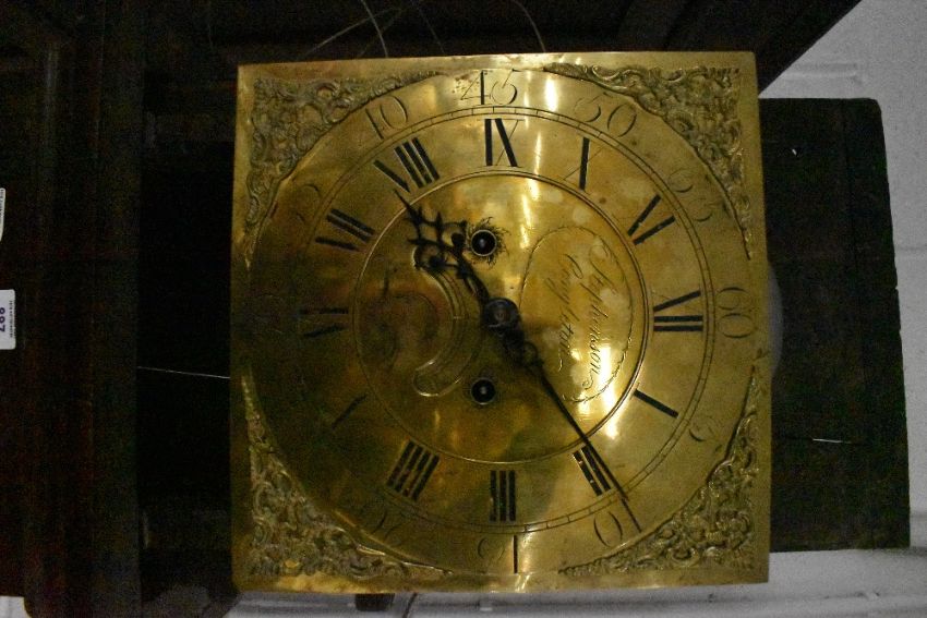 An 18th Century oak long cased clock having eight day movement with square hood and brass dial named for Stephenson , Congleton