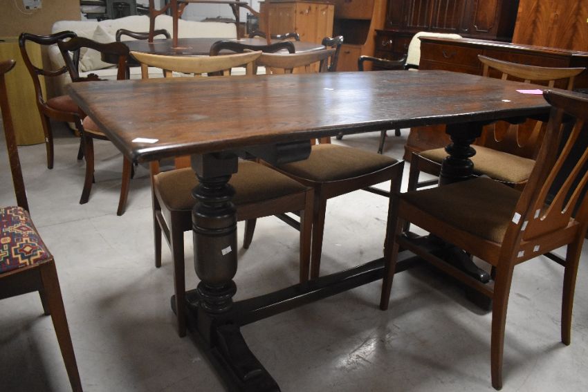 A modern oak refectory style dining table having bulbous column supports, approx. 152 x 77cm