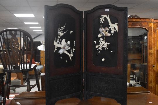 An Oriental bi fold fire screen in the Shibayama style having bird relief decoration in bone and mother of pearl