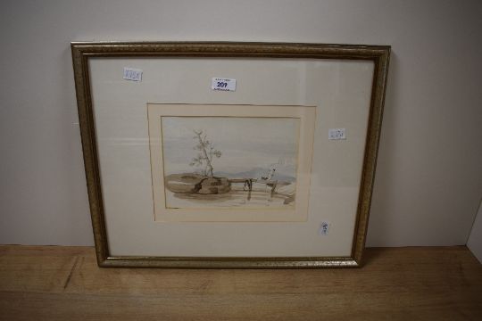 19th century English school watercolour on paper, an attractive depiction of a man walking a dog over a bridge with distant castle, attribution verso states that it was painted by a mid-Victorian member of Mary Wordsworth's (Nee Hutchinson) family, note in pen to frame verso states it was estimated at a value of '£250 - £300' on the Antiques Roadshow in 2007, within stepped card mount and moulded gilt frame, under glass 21.5cm x 15cm & 47cm x 38.5cm overall.