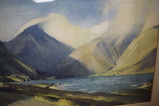 *Local Interest* After William Heaton Cooper (British 1903 - 1995) Lithograph 'Wind and Sun, Wastwater' a scene of the western Lake District with clouds drawing in over the fells, printed signature to lower right, within washline mount and wooden frame, under glass 37cm x 25cm & 55.5cm x 45.5cm overall. Sold alongside two more prints by the same artist, the first 'Young Ash in Spring', within wooden frame, under glass 31cm x 43cm & 33cm x 45.5cm overall, the second 'After Sunset, Grasmere' mounted to card, 47cm x 36cm overall. Discolouration to all.