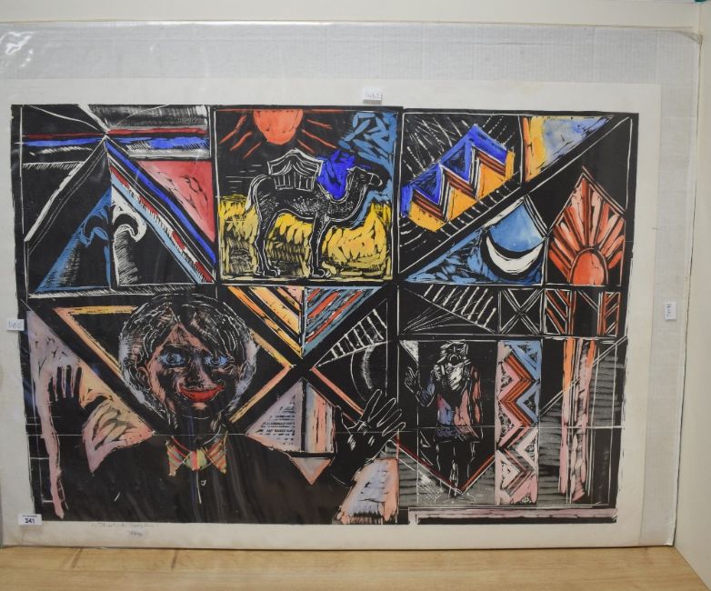 After Michael Rothenstein (British 1908 - 1993) Handcoloured woodcut print, depicting a range of scenes notably a person waving and a camel in the desert, signed in pencil to lower left margin, blind stamp 'Shelley Rose Argus Studio' to upper left, unframed 89cm x 60cm & 96cm x 68.5cm overall.