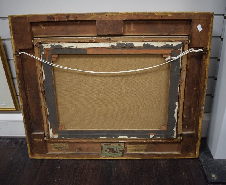 Some minor cracking to painting, some small dark patches visable under UV light which could be an indication of a small amount of overpainting. Frame appears to have been repaired at some point, there seems to have once been paper backing over the canvas and new nails have been applied.