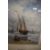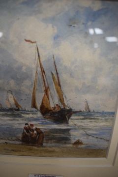 19th century English school watercolour on paper, a maritime scene with boats and sailors coming into shore, signed indistinctively to lower right, appears to be dated 1884, within stepped card mount and moulded gilt frame, under glass, 11cm x 13cm & 25cm x 27.5cm overall.