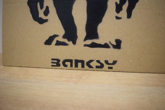 In the style of Banksy (British b.1974) limited edition graffiti stencil on cardboard 'Dismaland 2015' keep it real monkey 9/50 signed with stamp lower centre and reverse unframed. 38cm x 28cm overall.