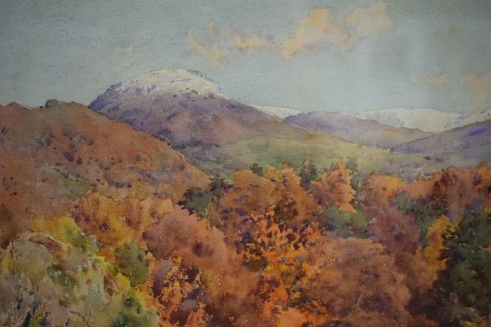 *Local Interest* Cuthbert Rigby (British 1850 - 1935) watercolour on paper, a classic Lake District scene with snow capped fells appearing above an autmnal woodland, signed and dated (1915) to lower right, within washline card mount and moulded frame, under glass, 31cm x 19cm & 44cm x 32cm overall.