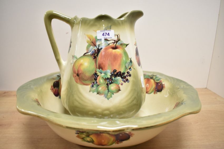A water jug and bowl in green and cream hues and having orchard fruit design.