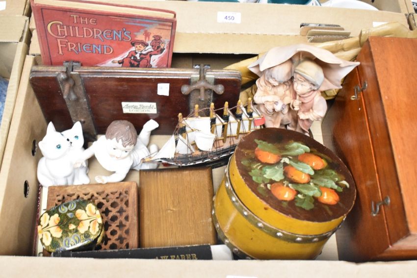 A wooden cylindrical trinket box with painted lid, tw2o smaller wooden boxes and a bigger pine box, a wooden ship, a vintage copy of The Children's Friend and a wooden wall engraving of a hunter etc.