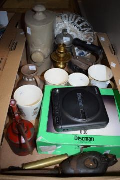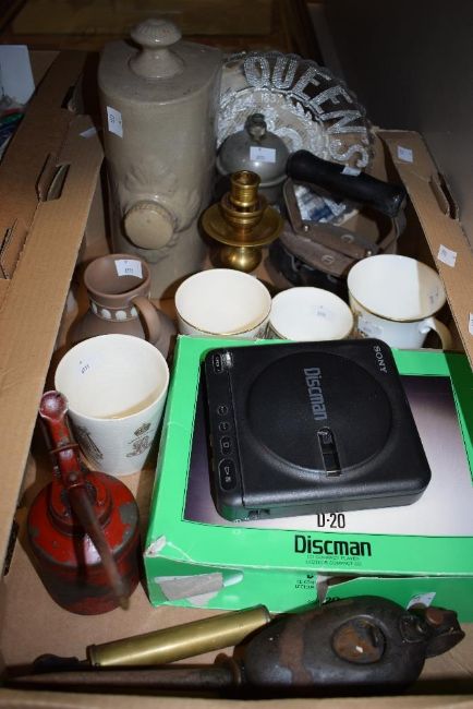 A miscellaneous selection of items including a stoneware hot water bottle, a brown Wedgwood jasper ware vase having shell relief pattern, a Sony Discman, a brass iron and candlestick and two vintage oil cans etc.