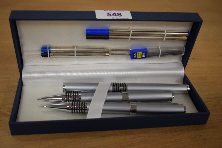 An eight piece pen set includes fountain pen, ballpoint pen and propelling pencil as well as refills for all