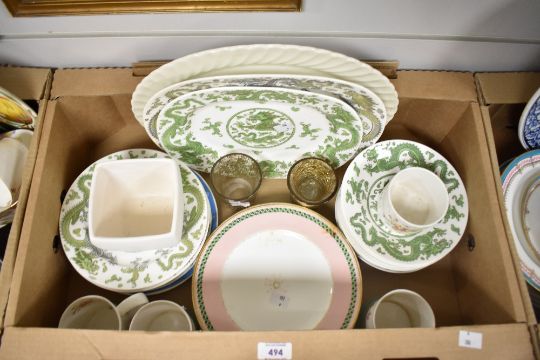 A Coalport 'Green Dragon' part dinner service (15) to include dishes, plates and serving platters, three Kath Kidstone 'Billie' mugs and matching sugar bowl and a pair of gilt patterned candle holders etc.