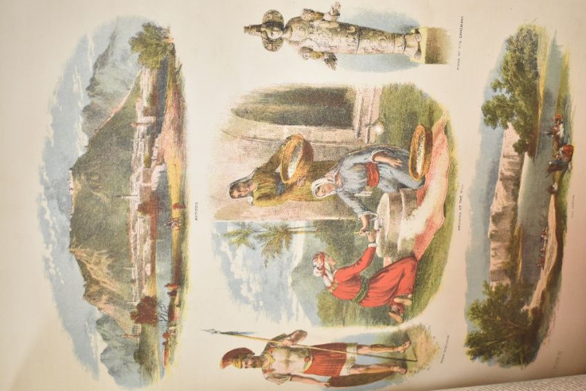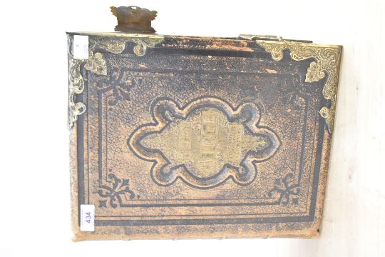 A large leather bound copy of the Holy Bible including an illustrative history of the Old and New Testaments having brass coloured corners 34cm x 26cm