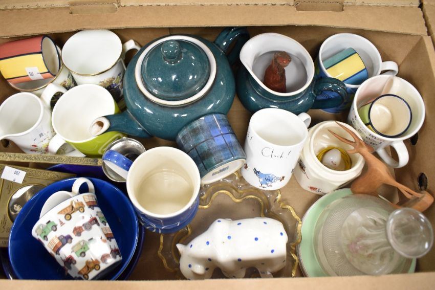 A Green Herdy mug, a Denby stoneware teapot and milk jug in teal green glaze with white inner, a selection of mugs and cups and a stylised polar bear study etc.