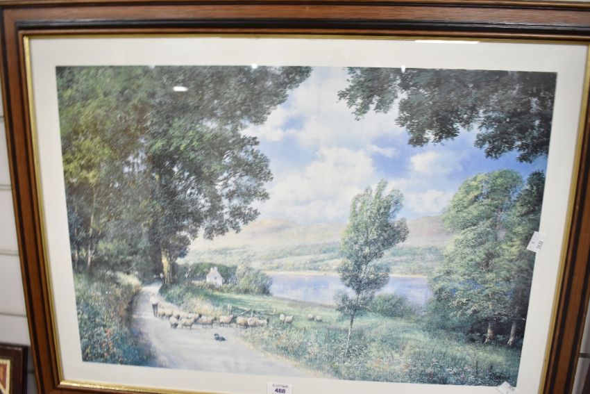 A modern print depicting a farmer herding sheep down a country lane framed and glazed 79cm x 58cm sold along with a watercolour of Lime-Kiln House Bideford Devon, signed H Thornton July 1953 to lower right hand corner, mounted framed and glazed 41cm x 33cm.