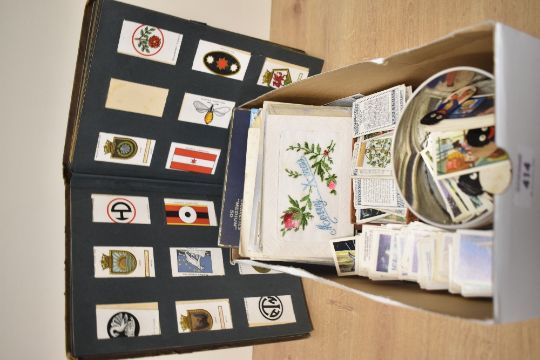 A mostly complete cigarette 'pictures' card album, sold together with a selection of loose cigarette cards and a small quantity of postcards (various)