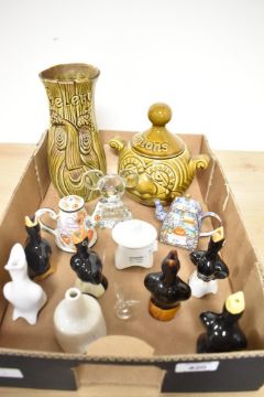 A Sadler crying onion pot with a similar celery vase, sold together with miniature teapots a Murano style glass bear and bird form pie vents etc