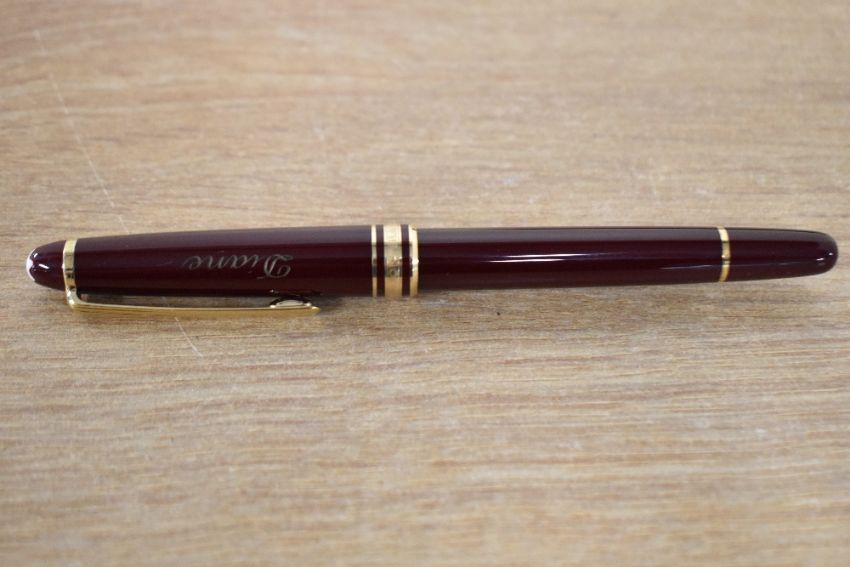 A Montblanc Meisterstuck converter fill fountain pen (CI1145124) in burgundy with gold trim having Montblanc 4810 14K 585 nib with leather pen pouch. Engraved