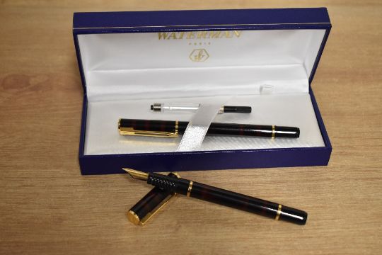 A boxed Waterman Laureat converter fill fountain pen and rollerball pen in Brown Shadow, the fountain pen having Waterman France M nib