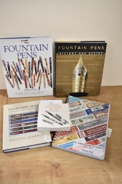 Five volumes including Fountain Pens and Design, Fountain Pens - The Collectors Guide to Selecting, Buying, and Enjoying new and vintage Fountain pens by Jonathan Steinberg, Fountain Pens - Vintage and Modern by Andreas Lambrou, The English Fountain Pen Industry 1875-1975 by Stephen Hull, and Collectable Fountain Pens by Juan Manuel Clark