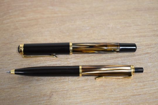 A Pelikan M400 piston fill fountain pen and ballpoint pen in Tortoise Brown Striped and Black having Pelikan 14C 585 M nib