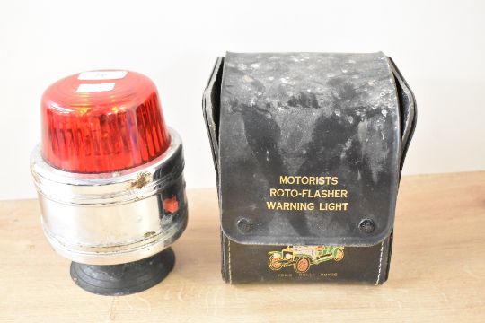 An early 20th-century Motorists Roto-Flasher warning light with original case, with Rolls-Royce to case, cylindrical metal body with rotating mechanism and red glass light covering, 16.5cm, considerable rust damage to body of light, condition consistent with age and improper storage.