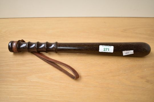 A 20th-century Hiatt and Company, Birmingham, turned mahogany police style truncheon, with leather strap to base of grip, marked to handle, 38cm, condition is conistent with age and use, general areas of surface wear, small scratches, leather strap in relatively good condition and a couple of deeper scratches to the end of the handle near the makers mark.