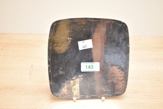 A 20th Century Borrowdale Staybrite stainless steel dish having hand beaten decoration to rim, raised on three cylindrical feet, measures 13cm x 13cm.