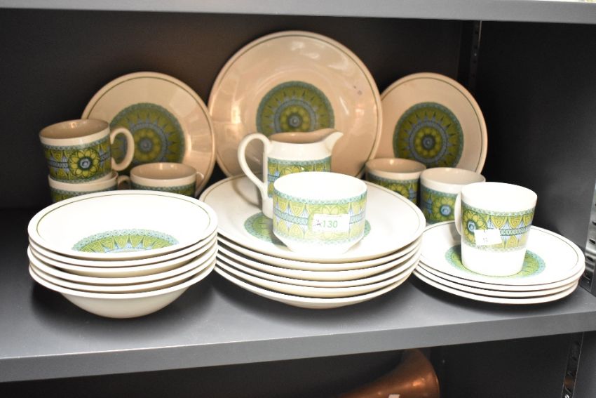 A 1970's ceramic part dinner/tea service having a distinctive green, brown and blue geometric pattern to a light cream back ground, comprising twenty seven pieces approximately.
