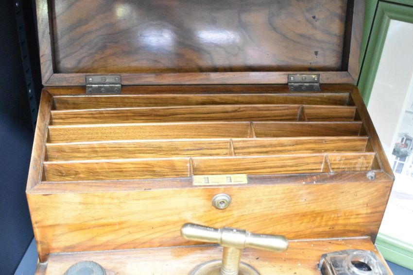 A rare and unusual Victorian walnut desk top stationery box/ink stand, by Samson & Mordan & Co, London, The hinged cover enclosing multiple divisions, the platform with inkwell apertures centred by a brass letter press screw, and fronted by pen well, the drawer with lift out press plate and oblong lined compartment. 27cm x 37cm x 32cm drawer tight fitting and requires some attention.