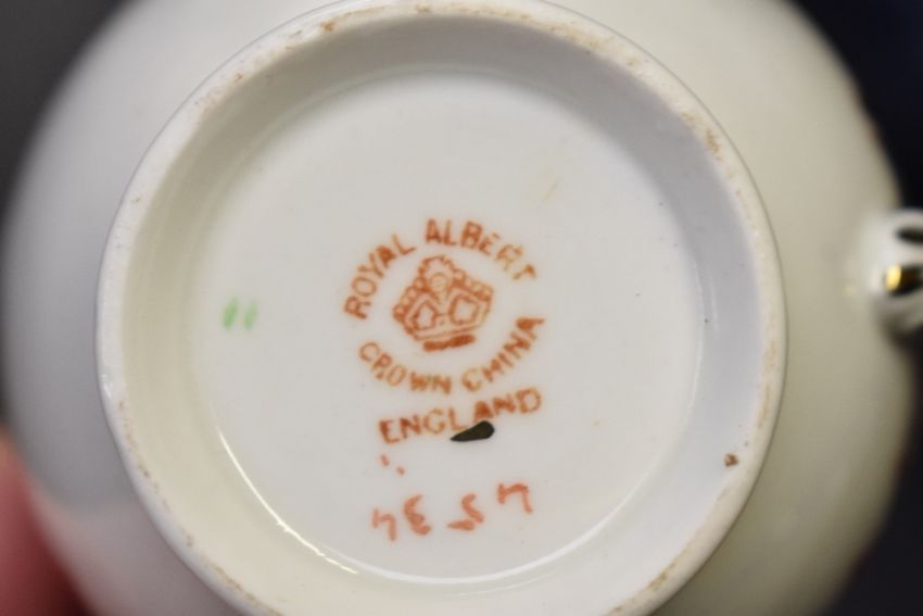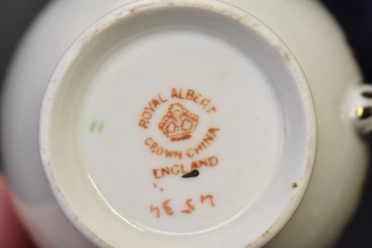 A 20th century Royal Albert Crown China 'Heirloom' tea set, featuring an Imari-style design with a cobalt blue and white ground, decorated with deep orange and gilded floral detailing; comprising small plates, cups and saucers, jug and sugar bowl, all marked to base, (23 pieces), good used condition.
