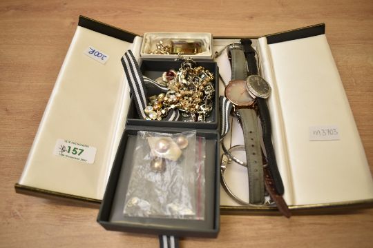 An assortment of costume jewellery, including a vintage marcasite floral scroll necklace, a Radley wristwatch, an Emporio Armani wristwatch having a diamond set outer dial and mother-of-pearl dial, paste set items and three unset blister pearls SILVER NECKLACE IN LOT???