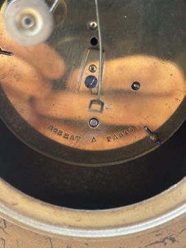 A Robert.A.Paris mid-19th century gilted brass mantel clock, unusually surmounted with a depiction of a painter, having Roman numeral engraved silvered dial, complete with key and pendulum, measures 34cm tall.